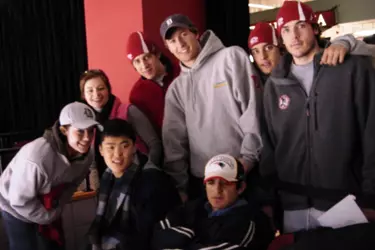 BOSTON - On February 11, the Boston University men's ice hockey team, in conjuction with the National Alliance for Autism Research, hosted a group of autistic children from the Melmark School. The Terrier team, along with coaches Jack Parker, David Quinn and Mike Bavis, presented the kids with BU t-shirts, pucks and posters. Afterwards, the group enjoyed a pizza party lunch while watching the team practice at Agganis Arena.